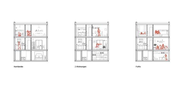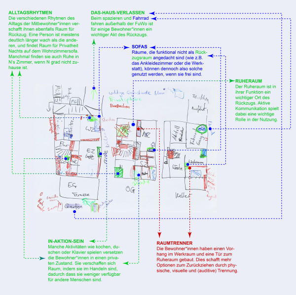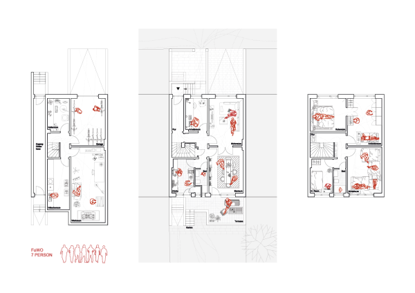 Während der Auseinandersetzung mit der FuWo sind uns zwei Themen besonders aufgefallen: Erstens interessierte uns die Aneignung der vorgefundenen Räume und die Intentionen zu deren Umnutzung. Zweitens zeigt sich in der Veränderung der räumlichen Form zugleich eine in der Bedeutung von Privatsphäre. Die Fallstudie verfolgt diese Themen als Referenz für das Umdenken eines Wohnverständnisses im größeren Kontext, wie es darin auch ein Modellprojekt für zukünftige alternative Wohnprojekte erkennt.