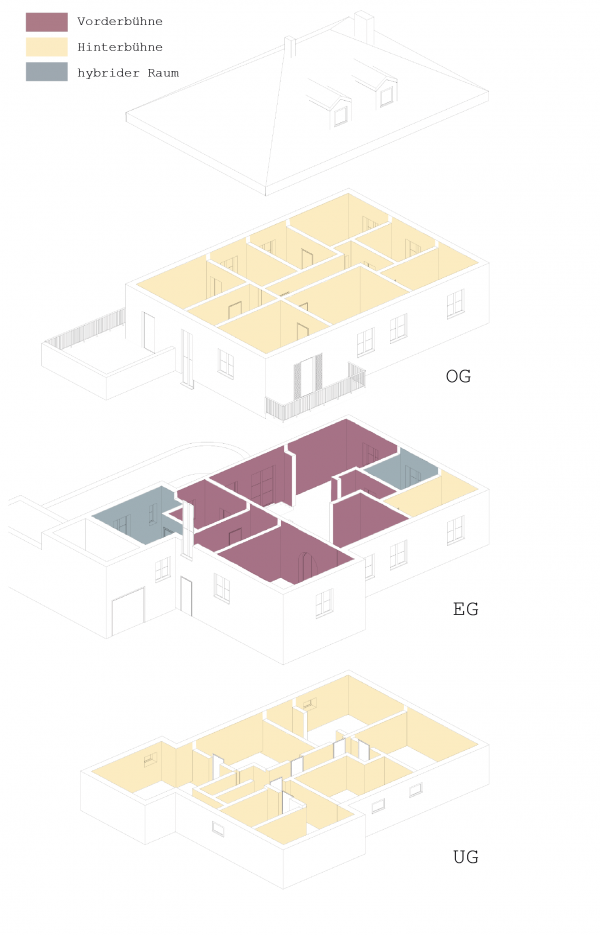 Seit 2019 bewohnen Frau S. und Herr T. das große Haus nur noch zu zweit, womit beiden ein Grundstück von insgesamt 760 m2 und ein 3-stöckiges Haus (inklusive Keller & unausgebautem Dachstuhl) mit Fläche von 500 m2 zur Verfügung steht. Bereits 2014 hatte Frau S. jedoch ihr eigenes Unternehmen gegründet, wodurch ein Teil des Hauses gewerblich für den Vertrieb und den Verkauf ihrer Modeprodukte genutzt wird. Daher dient das Gebäude nicht nur als Wohnort für die beiden Eigentümer:innen, sondern auch als Arbeitsort für mehrere Angestellte. Diese zirkulieren in unterschiedlichen Rhythmen und Aufenthaltsdauern im großen Haus und verfügen allesamt über verschiedene Aktionsräume und Zugangserlaubnisse.