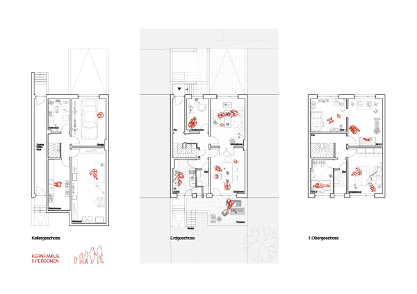 Das Reihenhaus entspricht dem klassischen Einfamilienhaus in der Zimmeraufteilung und der -struktur. Zwischendurch wurde es zur Vermietung in zwei Wohnungen geteilt, eine zusätzliche Küche im OG eingebaut. Die FuWo hat in Absprache mit der Vermietung diese Maßnahmen wieder zurückgebaut. Im Keller befinden sich Werk- und Wäscheraum sowie die Fahrradgarage, im Erdgeschoss die Küche, Ess- und Wohnzimmer, Arbeitszimmer und ein kleines Bad. Im Obergeschoss ist das Schlafzimmer, der Ankleideraum, über welchen der Ruheraum zugänglich ist, ein weiteres Bad und ein Privatzimmer. Außerdem gibt es einen Garten. Im gesamten Haushalt finden sich die Ergebnisse gemeinsamer Projekte – ob die Sauna im Garten, verschiedene Bepflanzungen, Dekorationen vergangener Events oder ein selbst gebauter Kleiderschrank.