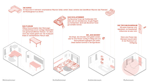 Die „Funktionale Wohngemeinschaft“ (FuWo) bezieht ein Reihenhaus, welches in den 1960ern für die klassische Kernfamilie gebaut wurde. In einer FuWo teilen sich die sieben Bewohnenden fast alles; von Räumlichkeiten, über Kleidung, Lebensmittel bis zu den Emotionen. In einer „Ego-Box“ können sie dennoch persönliche Gegenstände bewahren. Das Wohnen wird aktiv und gemeinschaftlich gestaltet. In ihren Bauwochenenden passen sie das Haus an ihre Bedürfnisse an und im regelmäßigen Plenum gestalten sie ihr Zusammenleben. Dabei kann es um Ideen, Bedürfnisse oder Vereinbarungen gehen.